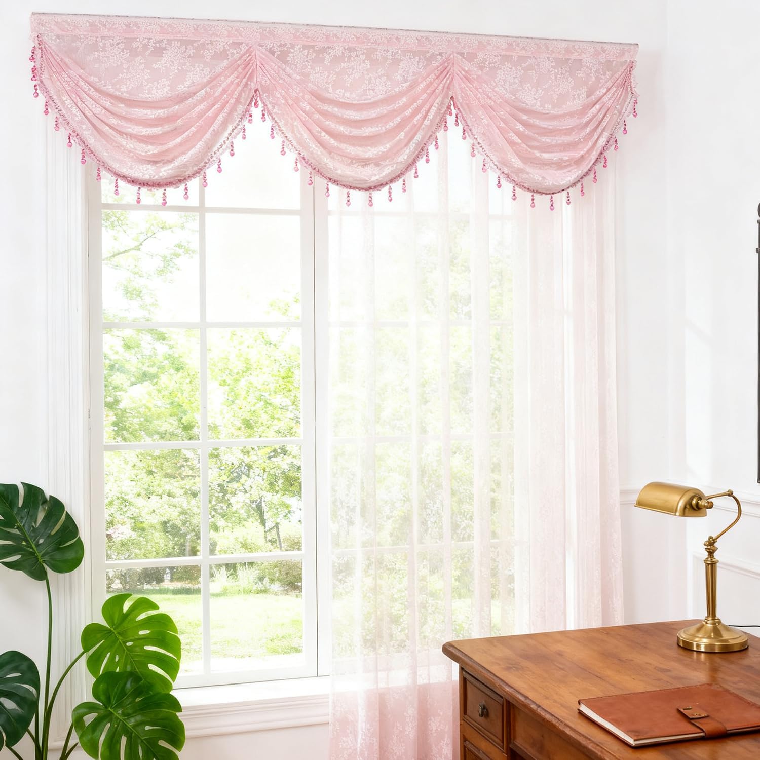 Transform your windows into a romantic showcase with this exquisite Princess Pink Floral Knitted Lace Swag Valance. The delicate scalloped design features luxurious beaded accents that create an enchanting Victorian-inspired aesthetic. Perfect for adding an elegant touch to kitchens, living rooms, or any space needing a soft, feminine flourish. The rod pocket design ensures easy installation, while the graceful swag draping creates beautiful dimension and visual interest. The knitted lace material combines classic charm with modern sophistication, making it an ideal choice for special occasions like weddings or Valentine's Day decorations. The soft pink hue and intricate floral pattern diffuse natural light beautifully while maintaining privacy. This versatile window topper adds a perfect finishing touch to your home décor, bringing together both functionality and decorative appeal in one stunning piece.
