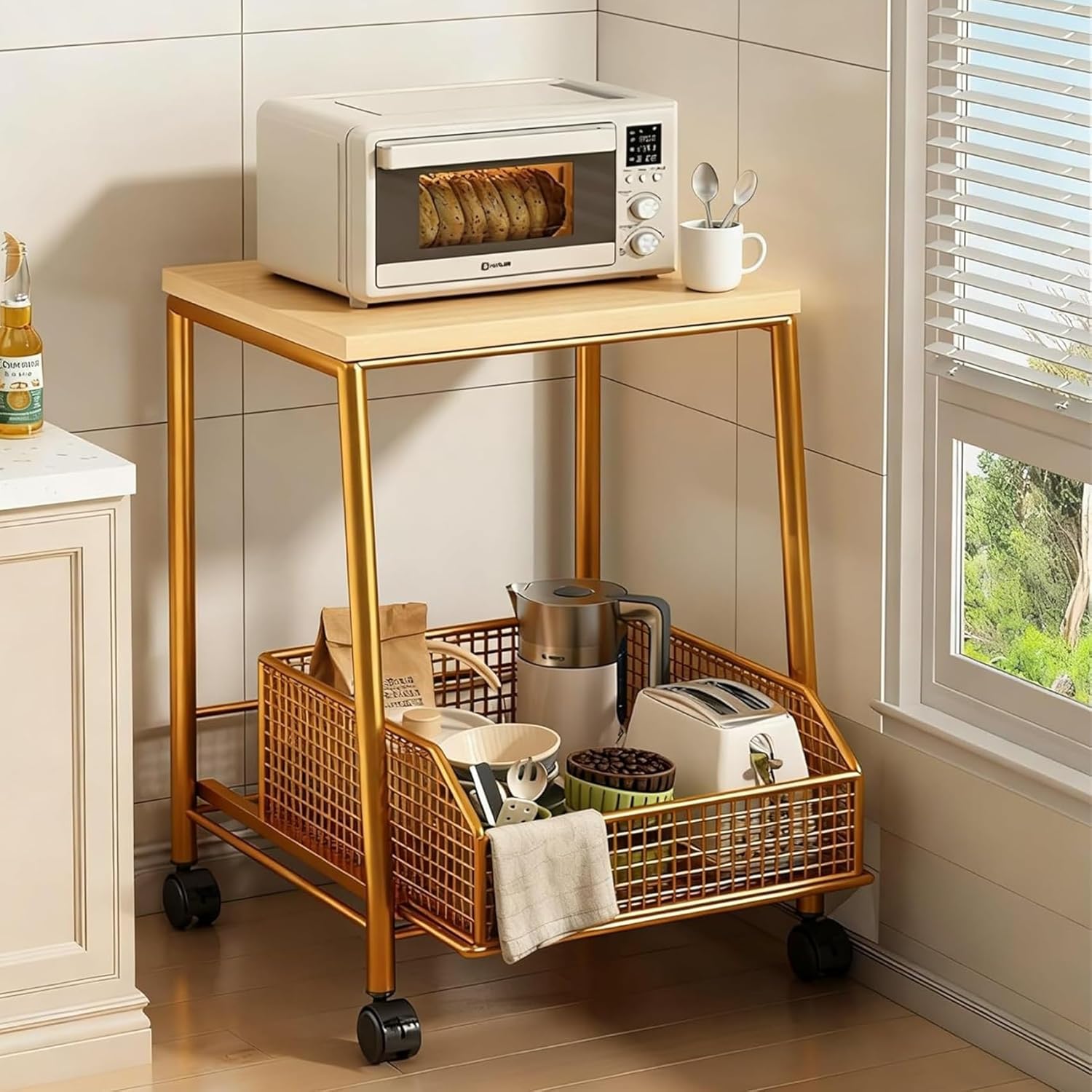🌺 - - - - - - - - - - - - - - Welcome To Our Shop - - - - - - - - - - - - - - - 🌺Discover the ultimate heavy-duty storage solution for your home. Our Rolling Kitchen Cart is a versatile 2-tier shelving unit designed to organize your kitchen, pantry, coffee bar, and beyond.This isn't just a cart. Need a stable microwave stand? A mobile kitchen island? A compact pantry rack for storage? This unit does it all. The standout feature is the large, slide-out storage basket at the bottom, providing concealed yet easily accessible space for vegetables, snacks, or bulky kitchen supplies.Built to last, the cart features a reinforced metal frame construction. The heavy-duty steel and L-shaped crossbar provide exceptional stability, allowing you to safely use it as a fridge stand or to hold small kitchen appliances without wobble. The metal shelving units are both strong and easy to clean.Navigate your space with ease. The smooth-gliding wheels (lockable on the main cart) allow you to reposition this storage organizer in seconds—pull it out as a serving cart, then tuck it away. Its smart dimensions are perfect for utilizing small spaces, acting as a kitchen table helper, or fitting into narrow gaps as a cabinet with extra storage.Achieve a clutter-free home. Use the top shelf for appliances, the middle for cookbooks or spice jars, and the pull-out basket for onions or potatoes. It functions perfectly as a storage cabinet alternative, a bar cabinet base, or a dorm room organizer.Setting up your new storage shelves is simple. With an intuitive assembly process, you'll have your new kitchen cart and shelf organizer ready for action quickly. Transform your approach to organization with this practical, sturdy, and mobile storage cart for every room.