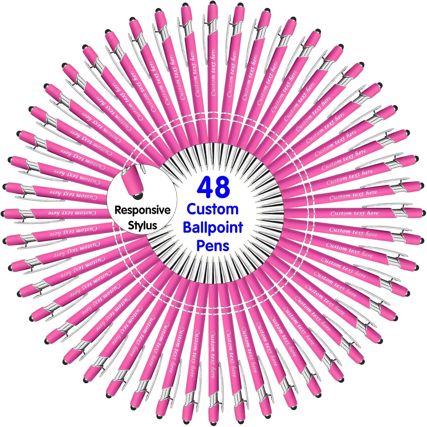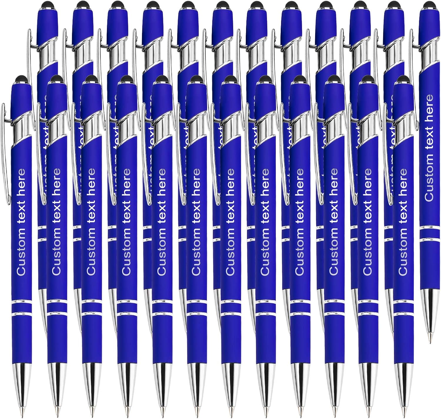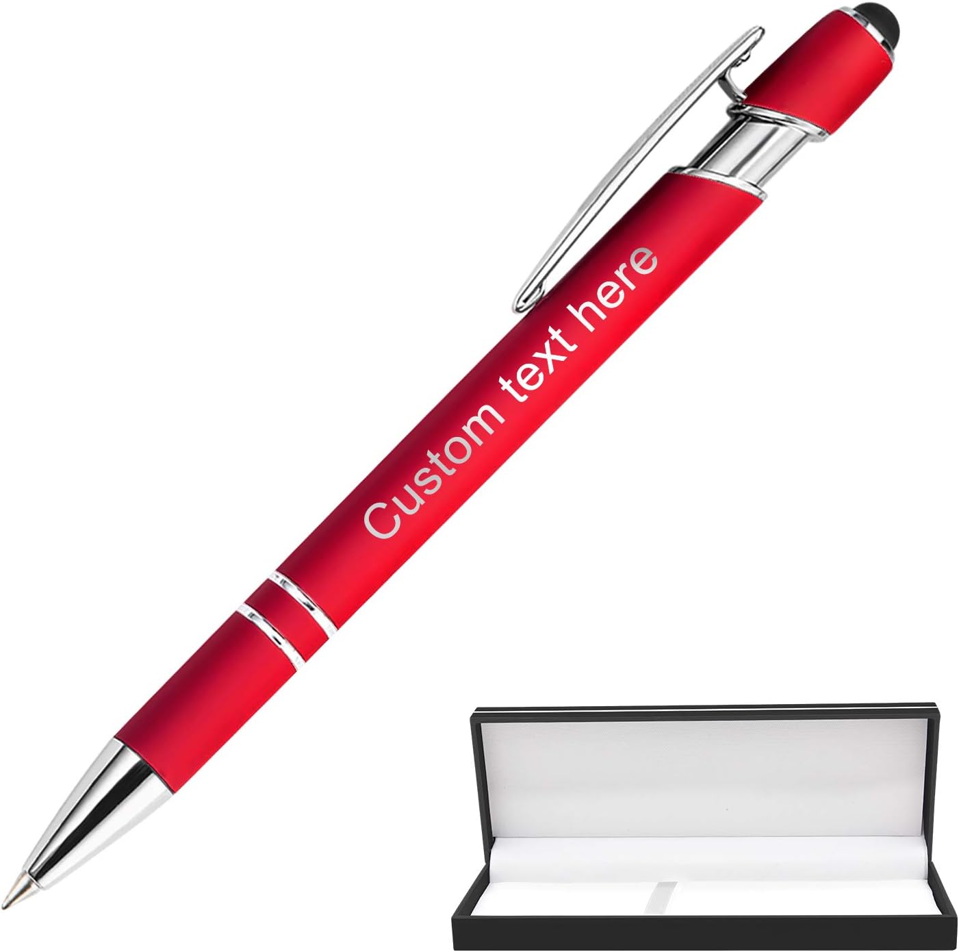 Pens with:Complete colorsClick ballpoint penDuel-purpose durable penFree Personalized Engraving Soft-Touch pen with metal frameWorks on SmartPhones, Tablets, Touchscreen device, and PaperNote:1 PC pen will with a box and every 12 pcs pen will pack with felt bag.