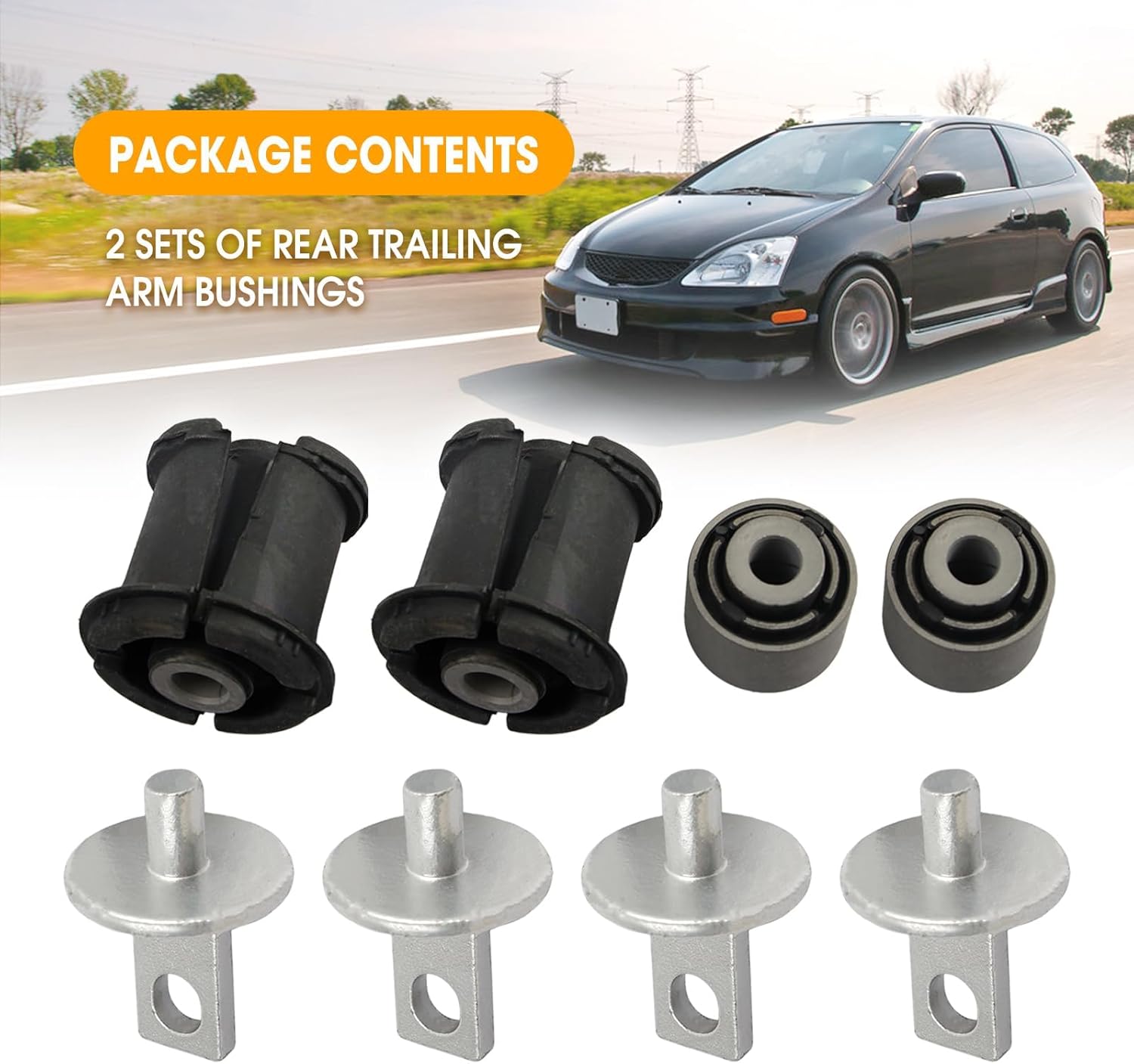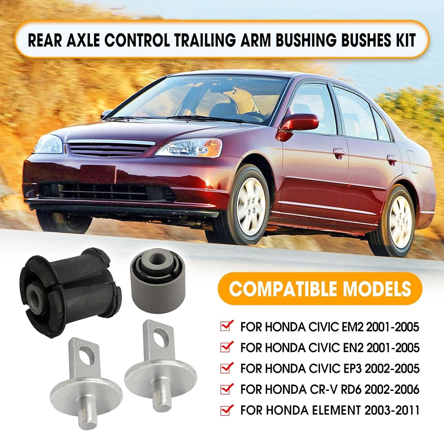 Restore Stability and Ride Quality with Our Premium Rear Trailing Arm Bushing KitIs your Honda vehicle experiencing unusual noises from the rear suspension, loose handling, or uneven tire wear? Worn-out trailing arm bushings are a common culprit. Our complete 8-piece bushing kit provides a cost-effective solution to renew your vehicle's rear axle and control arm connections, bringing back a tight, quiet, and confident ride.🔧 Exact Compatibility & Part NumbersThis kit is engineered to be a direct replacement for the following applications:Replacement for Honda Civic: 2001, 2002, 2003, 2004, 2005 (Models: EM2, EN2, EP3)Replacement for Honda CR-V: 2002, 2003, 2004, 2005, 2006 (Model: RD6)OE Part Numbers This Kit Replaces:52371-S9A-A02, 52370-SMA-040, 52371-S5A-030, 52371-S5A-A50, 52371-S6D-G00, 52371-S9A-020, 52371-S9A-A01, and related numbers.⚠️ Compatibility is Critical: Always match your old part’s shape and number with our photos and list. Verify your vehicle’s VIN or consult a professional if unsure.📦 What’s in the Box?You will receive 2 complete sets of rear trailing arm bushings, totaling 8 pieces. Each set allows you to service one side of the vehicle. This ensures a balanced repair for both left and right trailing arms.