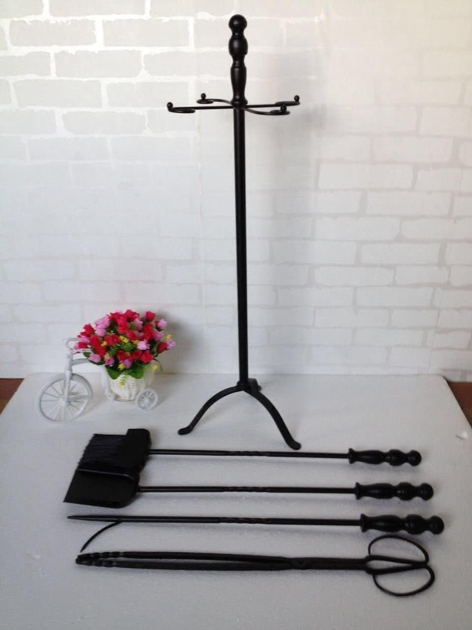 Fireplace Tools Specification Name: Fireplace tool set Package include: 1 x Solid base 1 x Tong 1x Shovel 1x Broom 1x Poker Weight: 4KG/8.8 lbs Color: Golden black Affected by the lights and the screen show, there maybe some chromatic aberration, please refer to the actual color.