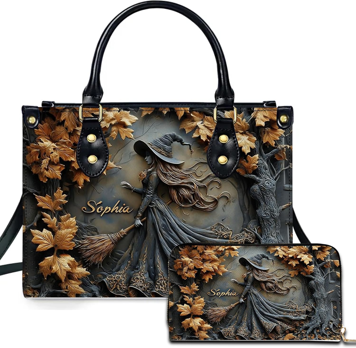 🎃 Personalized Halloween Leather Handbag – Custom Name Tote with Optional Matching PurseCelebrate spooky season in style with this custom Halloween leather handbag, designed for witches, goth girls, and Halloween lovers. Add your name or a loved one’s for a hauntingly beautiful accessory that’s uniquely yours.✨ Key FeaturesMaterial: Premium PU leather with smooth texture and fade-resistant 3D witch printDesign: Gothic Halloween-themed graphics – bats, spell books, witches, moons, pumpkinsCarrying Options: Sturdy handles and removable/adjustable strap for tote or crossbody useFunctionality: Spacious main compartment with secure zipper closureCare: Wipe clean with a damp cloth📏 Available SizesSmall: Ideal for light daily carry or festive outingsMedium: Perfect for daily use, errands, or light travelLarge: Roomy enough for planners, tablets, makeup bags, and more💼 Optional Matching PursePurse Size: 7.9"" x 4.3"" x 1""Lightweight and compact – fits cards, keys, or small essentialsEasily slips inside the main bag or can be used separately🎁 A Spooktacular Gift For Halloween lovers, gothic fashion fans, coworkers, moms, sisters, or witches-at-heart. Ideal for October birthdays, Halloween, spooky-themed events, or everyday gothic style.📦 Package Includes 1 x Custom Halloween Leather Handbag (Optional) 1 x Matching Leather Purse
