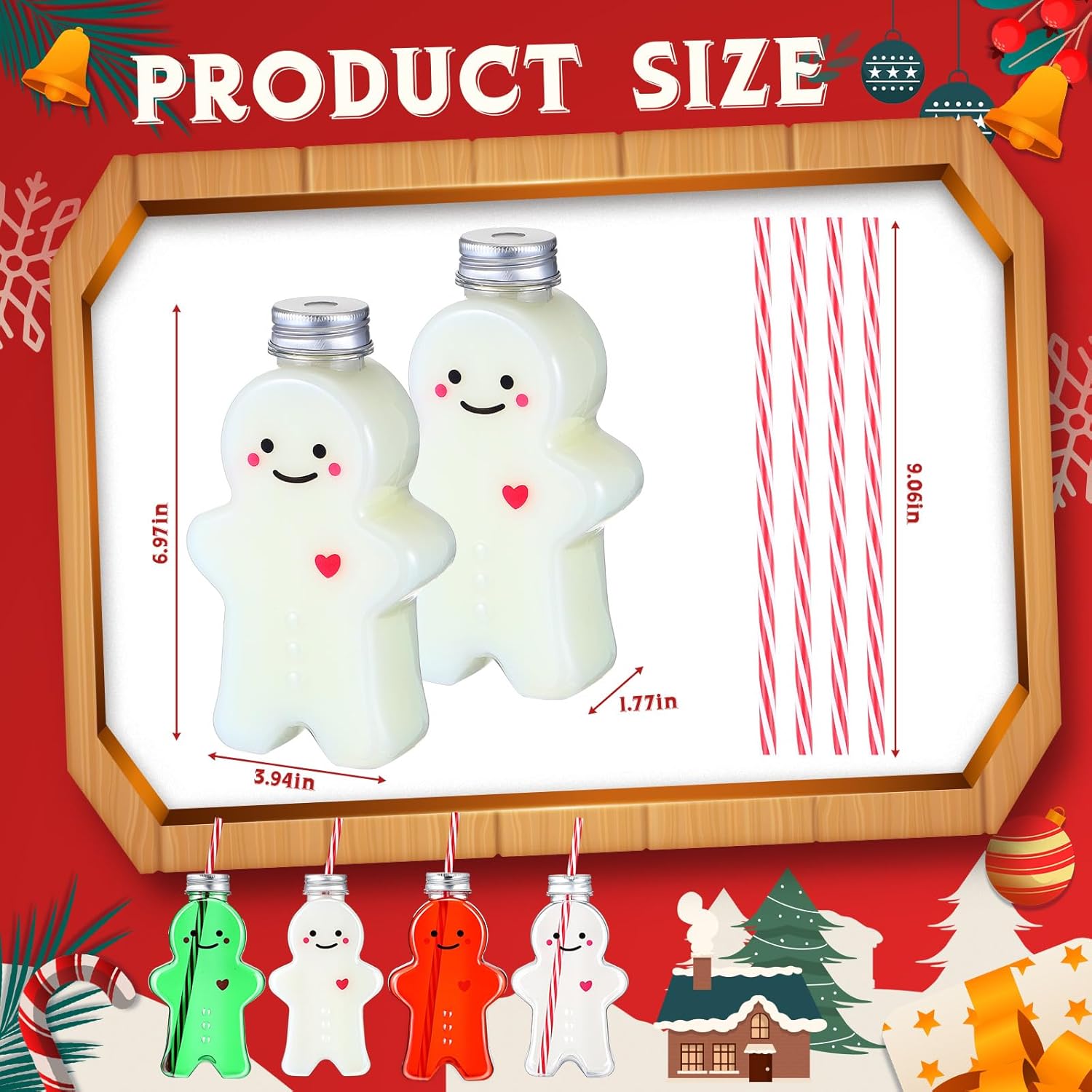 Features: The plastic reusable straw come with a rubber ring which effortlessly helps to fix them to the jar, making it convenient to use for children and adults alike. The jar, with a hole on the lid, is easy for the straws to get through. This feature adds an element of practicality to the attractive design. These charming Christmas Gingerbread Man milk bottles, with their delightful design and practicality, make the thoughtful Christmas gifts. Surprise your loved ones with these jars and let the spirit of Christmas fill their hearts with happiness and love. Specifications: Christmas Gingerbread Man jar: Material: PET plasticColor: clear and silverSize: approx. 6.97 x 3.94 x 1.77 inches/ 17.8 x 10 x 4.5 cm in bottom diameter, caliber and heightCapacity: approx. 17 oz/ 500 mlStraws: Material: PP plasticColor: red and whiteSize: approx. 9.06/ 23 cm in length and outer caliberPackage includes: 20 x Christmas Gingerbread Man jar 20 x StrawsNotes: Manual measurement, please allow slight errors on size. The color may exist a slight difference due to different screen displays.