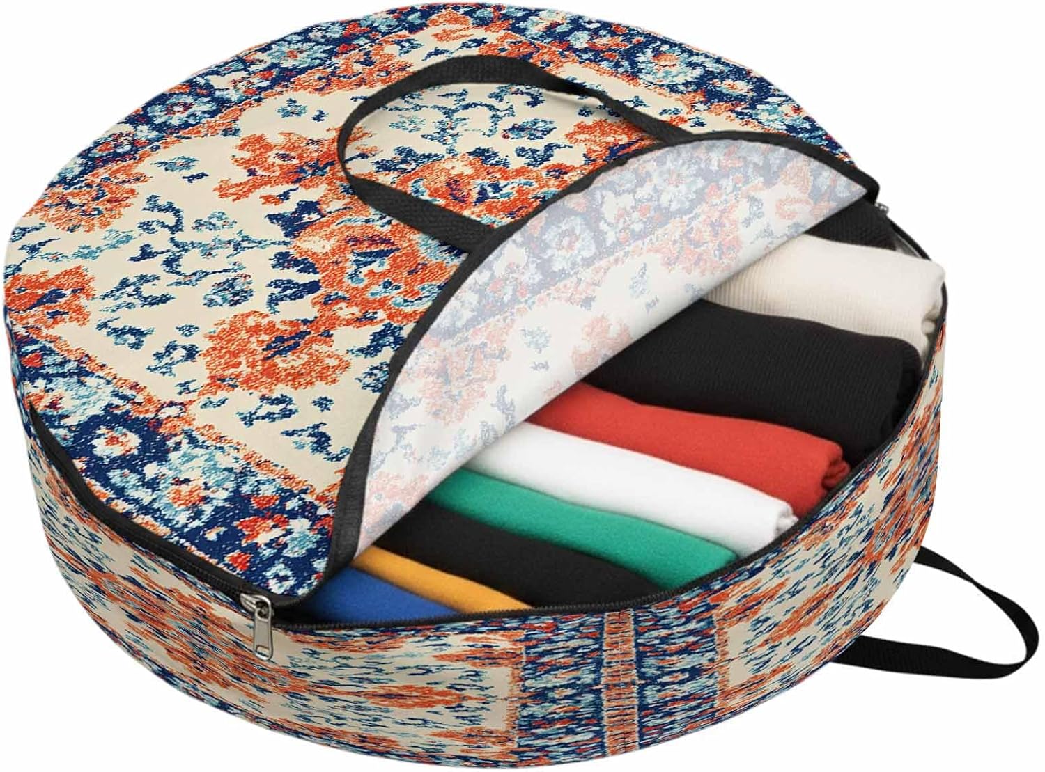 Reclaim Your Closet Space with the Round Storage Solution! Material: polyester Diameters: 24 inch, 30 inch, 36 inch Depth: 7 inches Package Includes: Round Storage Bag One Bag, Endless Possibilities: Whether you are swapping out your summer wardrobe, moving into a new dorm, or packing away holiday decorations, this bag has you covered. The circular design is uniquely suited for: Bedding: Comforters, quilts, sheet sets, and oversized pillows. Clothing: Winter coats, sweaters, and bulky ski gear. Home Decor: Holiday wreaths, garlands, and floral arrangements. Outdoor Gear: Camping blankets, sleeping bags, and beach towels. Dual Zippers: The high quality double zipper design allows the closet organizer to open wide from both sides, making it effortless to load and unload even the bulkiest comforters or wreaths. Reinforced Handles: Sturdy, reinforced handles are securely stitched to provide extra strength and a comfortable grip when carrying heavy loads or pulling the bag from under a bed. Clear Label Pocket: A transparent built-in label holder allows you to quickly identify the contents of each bag without ever having to unzip it, keeping your storage perfectly organized.