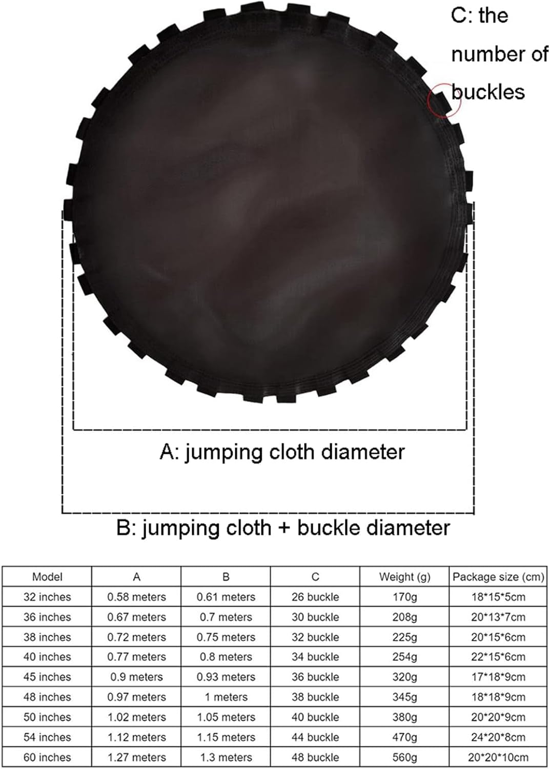Specifications:Name: Trampoline Replacement Jumping MatMaterial: PPColour: BlackSizes(about):32 inch in diameter 0.61 meters jump mat (26 buckles)36 inch in diameter 0.7 meters jump mat (30 buckles)38 inch in diameter 0.75 meters jump mat (32 buckles)40 inch in diameter 0.8 meters jump mat (32 buckles)45 inch in diameter 0.93 meters jump mat (36 buckles)48 inch in diameter 1 meters jump mat (38 buckles)50 inch in diameter 1.05 meters jump mat (40 buckles)54 inch in diameter 1.15 meters jump mat (44 buckles)60 inch in diameter 1.3 meters jump mat (48 buckles)Packing List:1 × Trampoline Replacement Jumping MatNotes:Due to the lighting effects and shooting angles, there is color difference in the product, please understand.Due to manual measurement, there is a tolerance in the product size.